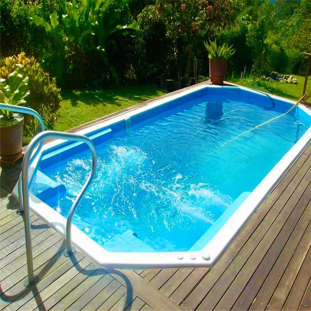 Bella piscina para un pequeño patio, con deck en madera y equipos de filtraciónPlanta de tratamiento de aguas negras completa.Piscina en Polyester o Fibra de Vidrio de rápida construcción, fácil y económico mantenimiento.Diferente tanques para almacenamiento de líquidos y sólidos en fibra de vidrio de alta durabilidad y resistencia.